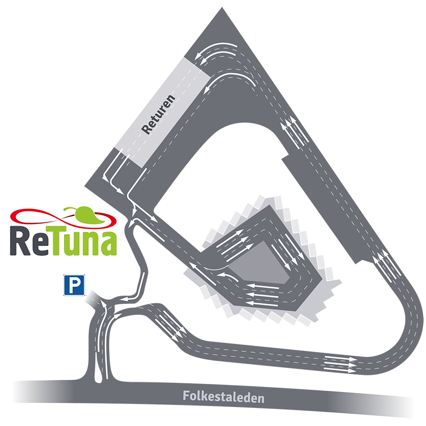 ReTuna Återvinningscentral ligger alldeles intill Återvinningsgallerian. Precis som på andra återvinningscentraler kan du här slänga grovavfall, trädgårdsavfall och farligt avfall. Men saker som kan användas igen lämnar du in till vår inlämningsdepå Returen. Depån är byggd som en så kallad ”drive thru” vilket gör det enkelt för dig att köra in och lämna saker med bil. Det går naturligtvis lika bra att lämna saker om du kommer till fots och på cykel. Dessutom är depån under tak, vilket gör inlämnandet lite extra bekvämt när det regnar eller snöar.